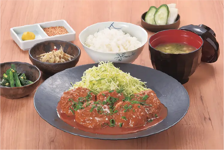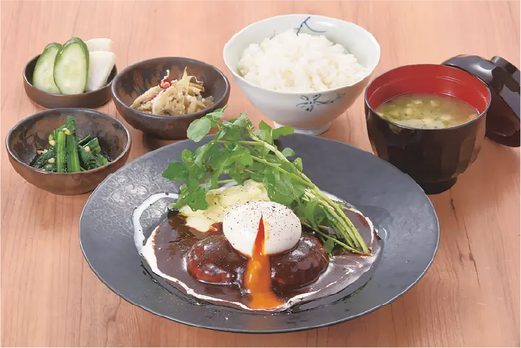 デミハンバーグ定食 - Hamburger Steak with Demi-glace Sauce, Topped with Soft-boiled Egg Set Meal